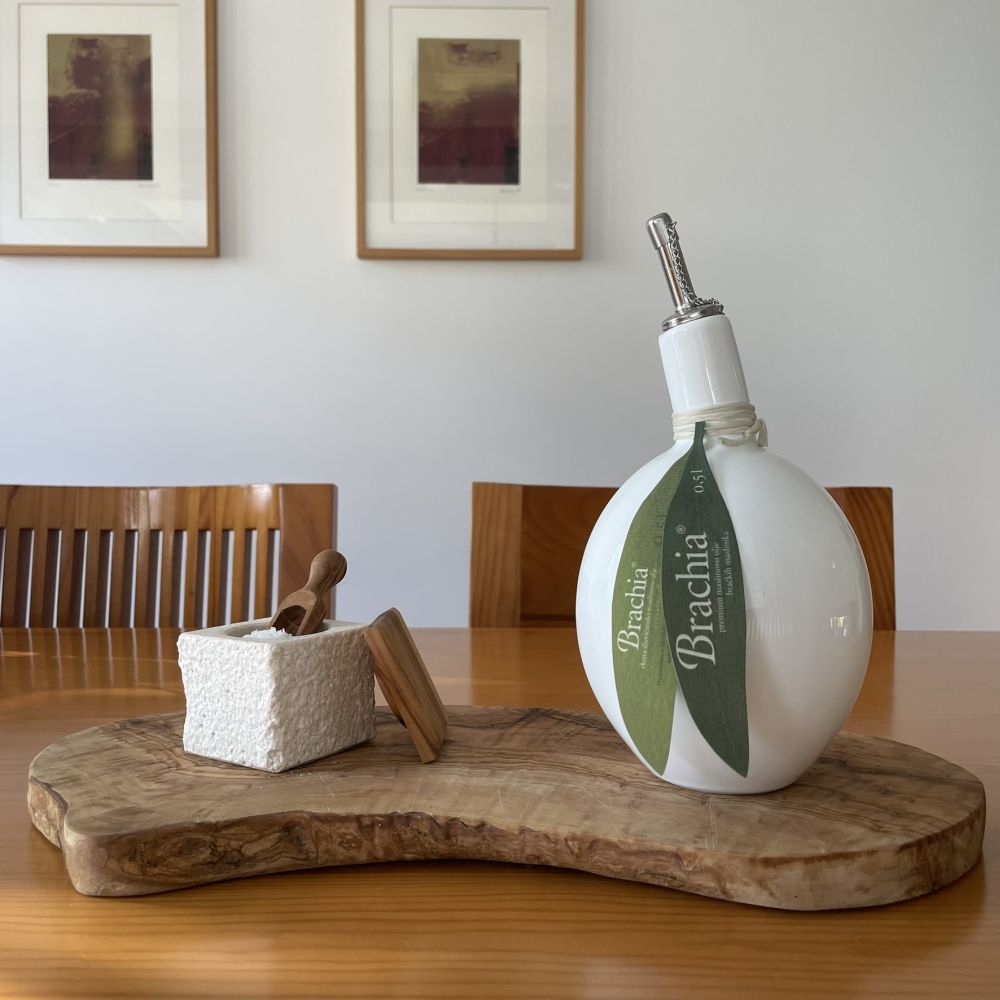 Brachia Premium Natives Olivenöl Extra in unserer einzigartigen Keramikflasche und das Fleur de Sel im Steintopf arrangiert auf einem Schneidebrett aus Olivenholz bilden ein wunderschönes Ensemble auf jedem schön gedeckten Tisch.